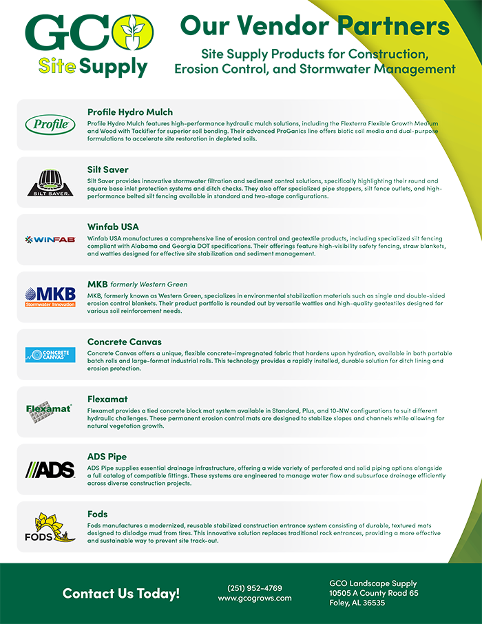 At GCO Landscape Supply, our Site Supply lineup is built for contractors, engineers, and project managers who demand durable solutions for stormwater management, sediment control, and soil stabilization on commercial and infrastructure projects across the Gulf Coast. We partner with trusted brands to stock hydro mulches, inlet protection systems, silt fencing, geotextiles, erosion control blankets, reinforced mats, drainage pipe, construction entrance solutions, and a full range of site restoration seed blends — everything you need to meet specifications and keep work moving safely and efficiently. From erosion mitigation on slopes to high-performance stormwater filtration and DOT-compliant sediment controls, our inventory ensures you get the right materials for civil, roadway, land-development, and environmental jobsites.